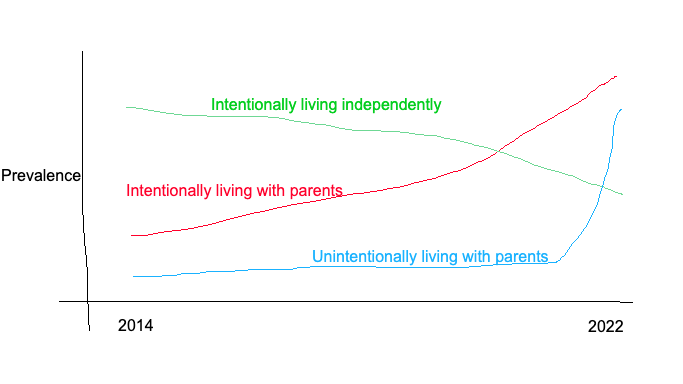 - Those intentionally living with their parents face less shock due to gradually increasing costs of living, but may generally have a more bleak outlook on their ability to become independent and fully transition into their adult lives. They may have greater struggles accepting and planning around this “new normal” of delayed independent adulthood.